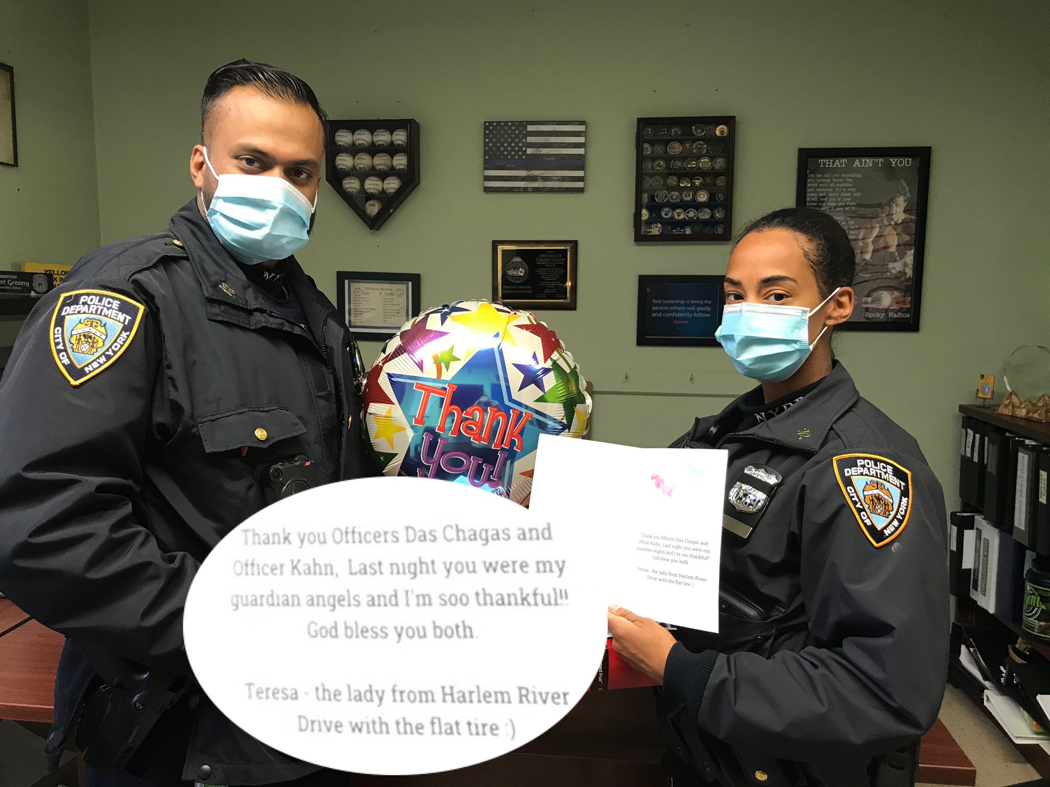 Postou:#NYPD Officer’s Khan & DasChagas spotted a motorist in distress with a flat tire on the #Harlem River Drive and did not hesitate to help. She was so appreciative, she sent this thank you note: “Last night you were my guardian angels & I’m so thankful! God Bless you both – Teresa”